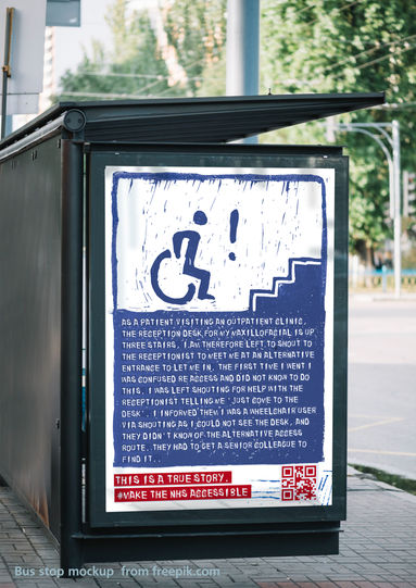 This project was my part of my uni work, I spent 6 weeks on it during my 2nd year of uni. My project was a social awareness campaign that talked about the inaccessibility of the NHS for disabled people. I was doing a printmaking block, where I got to try out a range of techniques - I chose to do Lino cutting to create all the images and the typography. The project was entirely self directed, so I made all the decisions about what to make and how I did it.